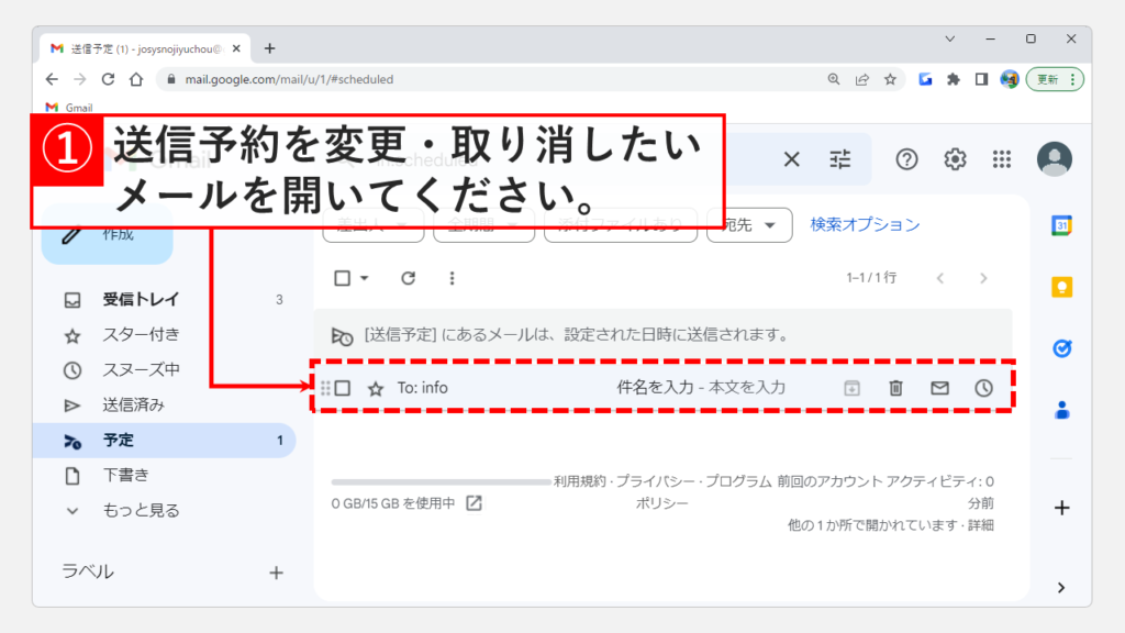 它位於“草稿”文件夾中。單擊您要更改或取消發送預約的電子郵件。請打開它。