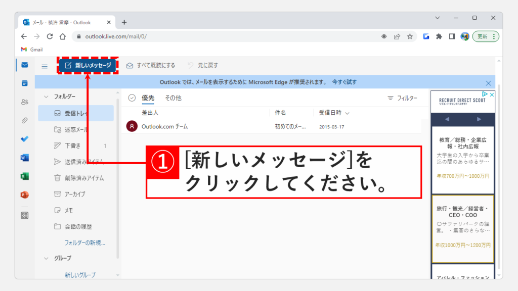Outlook.com(Outlook.live)登錄並在左上角點擊新消息請創建一個新電子郵件。