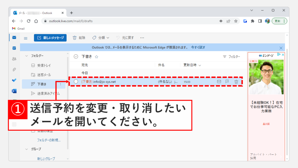 步打開“草稿”文件夾中您要更改或取消發送預約的電子郵件。
