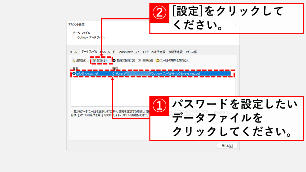 - 選擇要設置密碼的數據文件(.pst 文件),然後單擊[設置]按鈕。