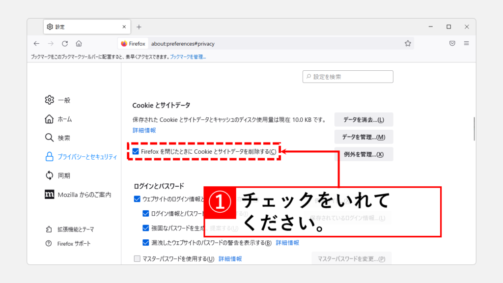 比那個低一點勾選[關閉 Firefox 時刪除 cookie 和站點數據]請。