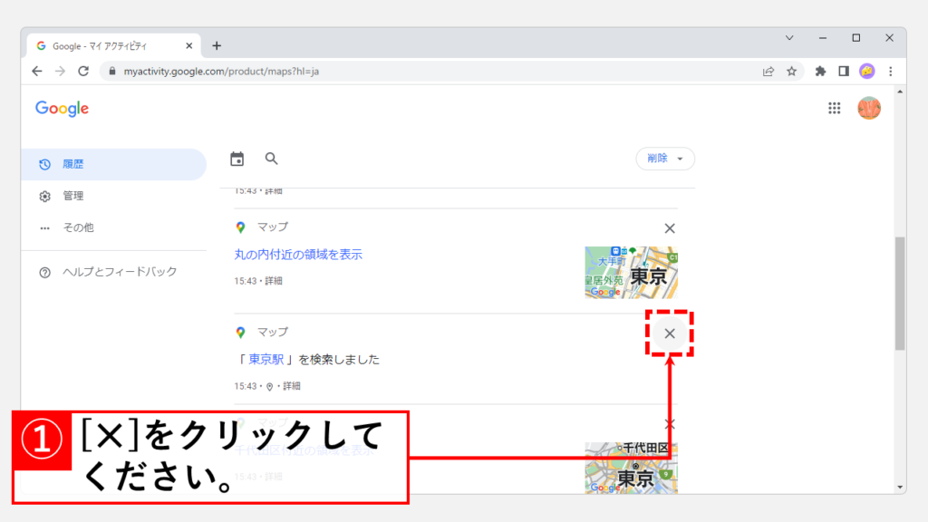 在那裡,您要刪除的 Google 地圖搜索歷史記錄的右側。點擊[✕]請。