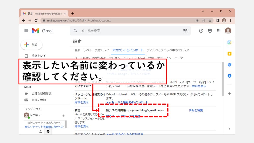 更改 Gmail 發件人姓名(顯示為發件人的姓名) 步驟 5 返回【帳戶和導入】選項卡,確認姓名字段已更改。