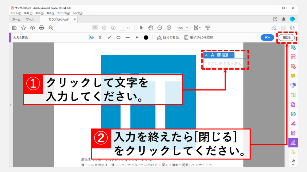 單擊[關閉]返回到原始屏幕並確認您輸入的字符已顯示在PDF中。