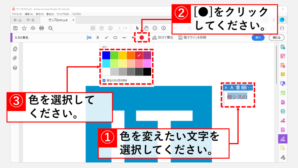 單擊筆標記上的[簽名]之後,選擇要更改顏色的字符,然後在“填寫並簽名”字段中單擊[●](更改顏色)請。