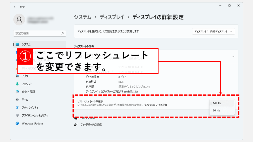 在該屏幕上,有一個標記為“選擇刷新率”的項目。在該項目的右側從下拉菜單中選擇刷新率請。