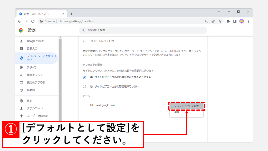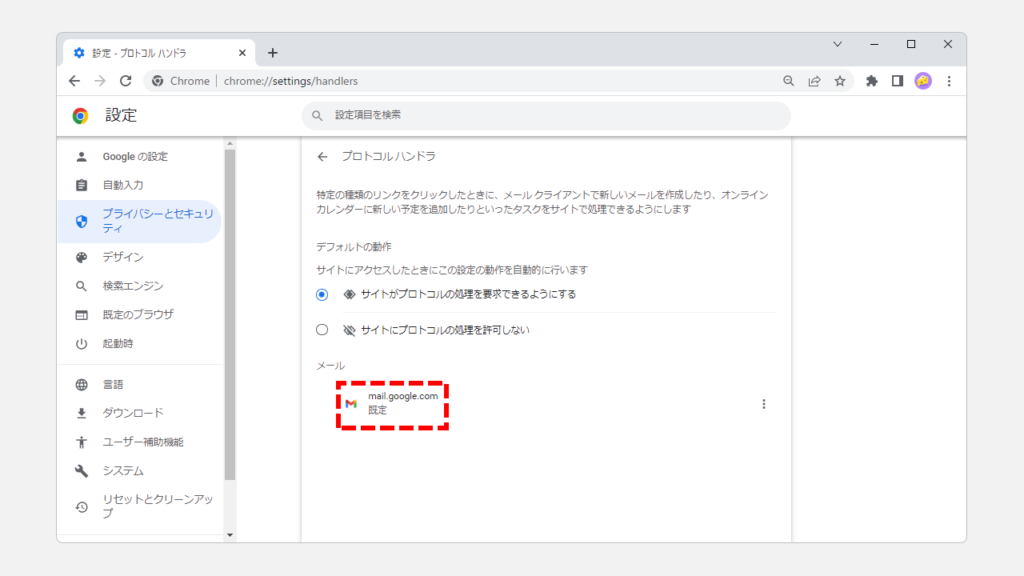 如果在此狀態下無法在 Google Chrome 的 Gmail 中打開電子郵件鏈接(mailto:),需要檢查 Google Chrome 設置那麼,接下來``如果即使更改默認應用程序後電子郵件鏈接也無法在 Google Chrome (Gmail) 中打開請繼續進行``。