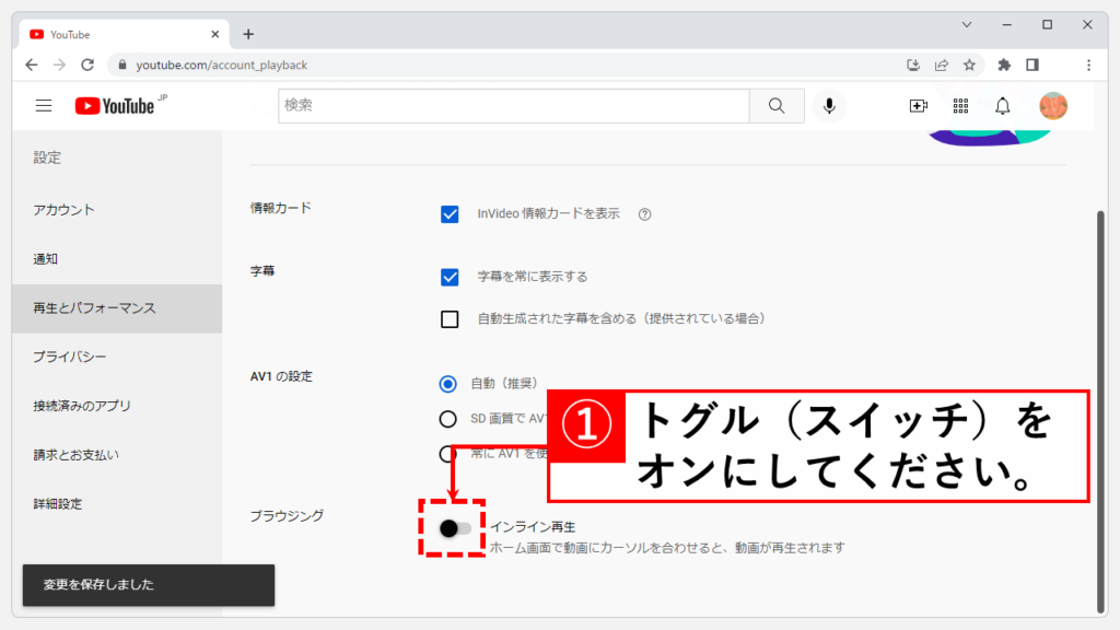 當您打開“內聯播放”開關時,瀏覽器左下角會顯示“更改已保存”。