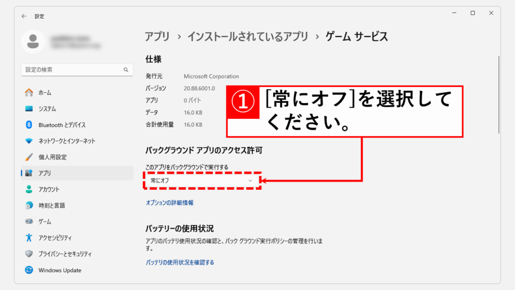 在其中在“後台應用程序權限”下拉列表中選擇[始終關閉]請。