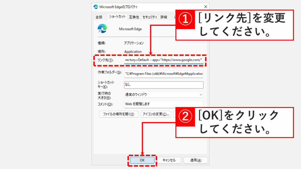 - 在最初寫入鏈接目標 (T) 的“C:Program Files (x86)MicrosoftEdgeApplicationmsedge.exe”後添加 –profile-directory=Default –app=”https://www.google.com/”