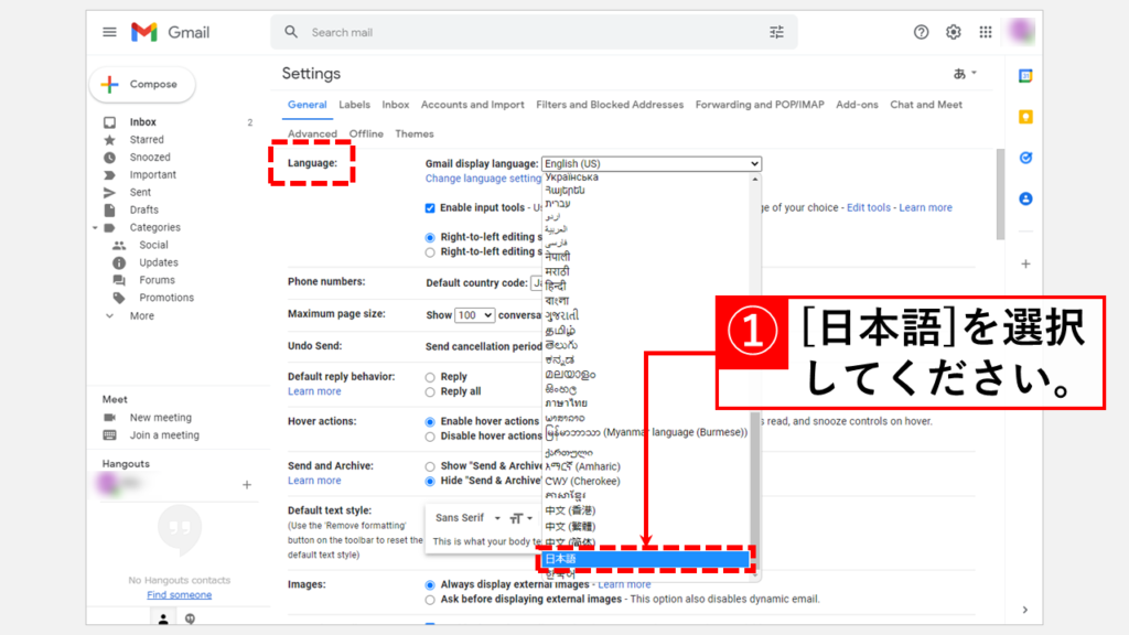 如果即使更改 Gmail 語言設置後 Gmail 顯示也沒有返回日語