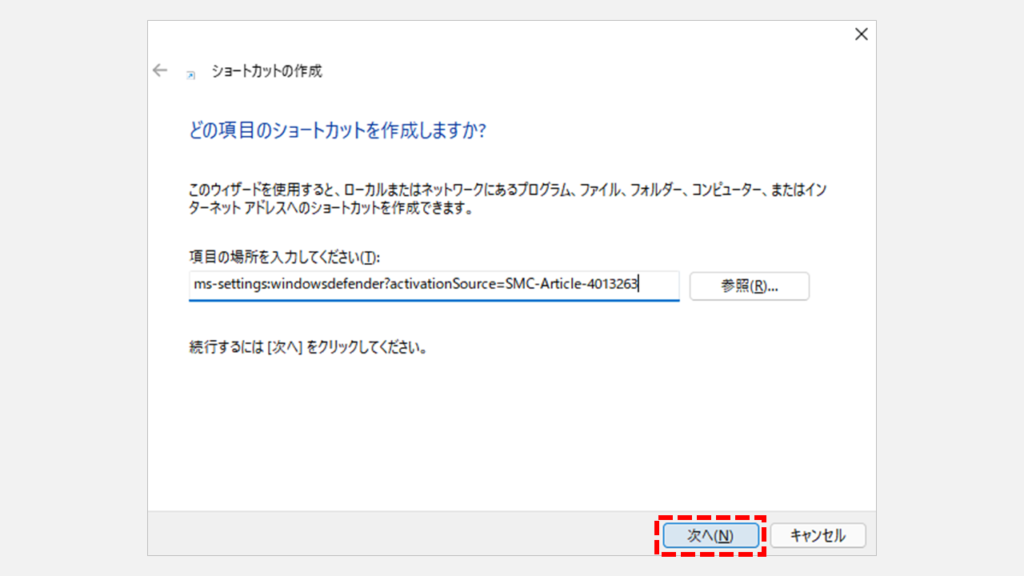 步在項目位置輸入ms-settings:windowsdefender?activationSource=SMC-Article-4013263,點擊【下一步】