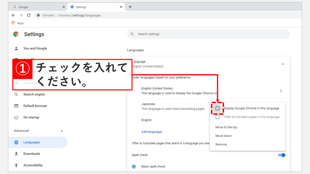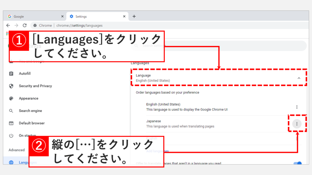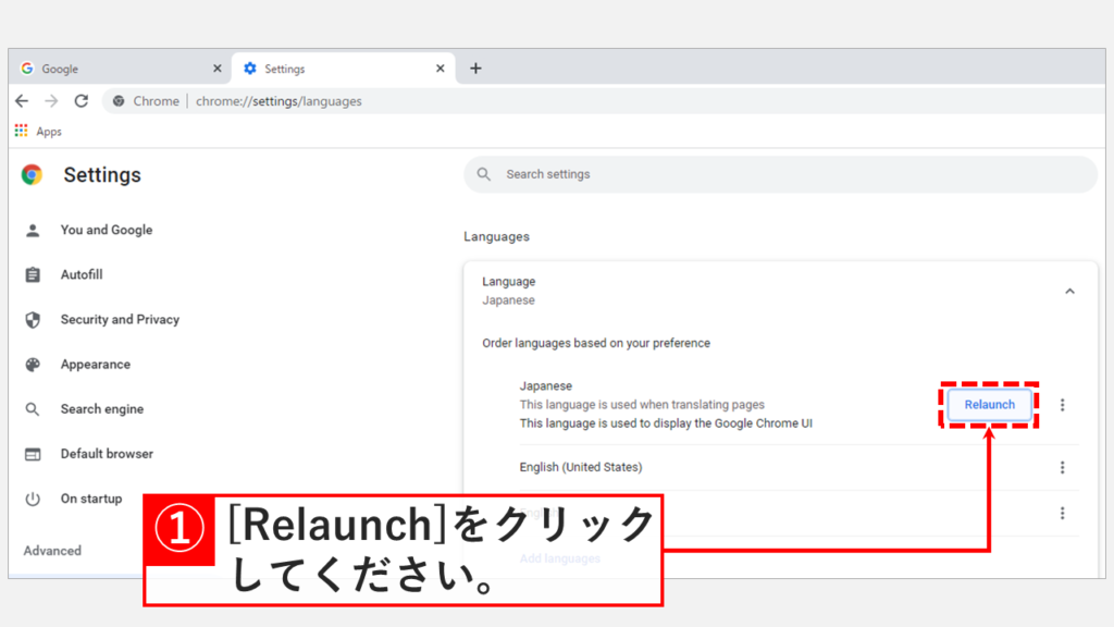 首先,我們將使用實際屏幕以易於理解的方式解釋如何從 Google Chrome 的語言設置屏幕將 Chrome 中使用的首選語言更改為日語。