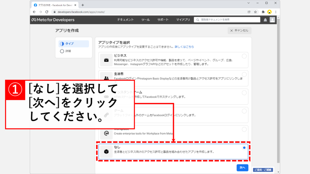 當您單擊[創建應用程序]時,您將被重定向到顯示[選擇應用程序類型]的屏幕。