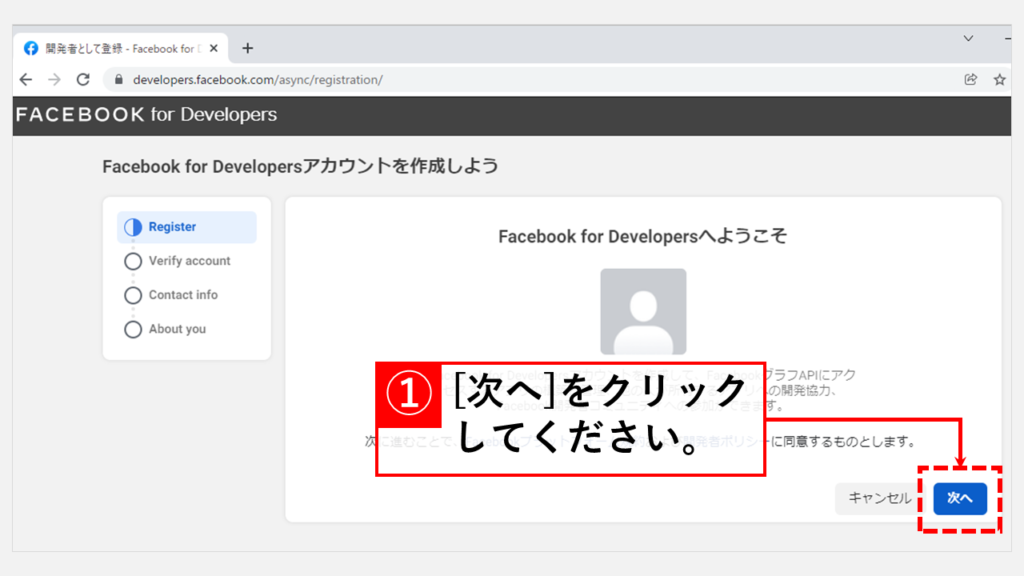 單擊“開始”後,您將看到一個頁面,其中顯示“創建 FACEBOOK 開發者帳戶”。
