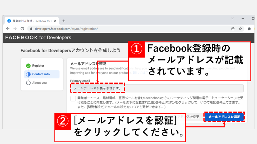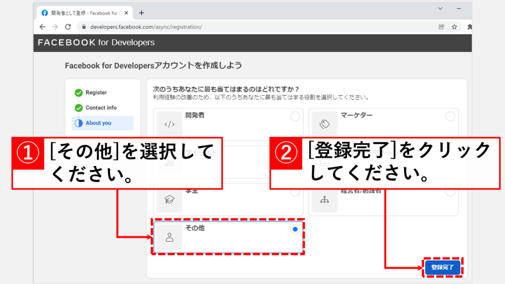 一旦您的電子郵件地址得到驗證,您將返回到“創建 FACEBOOK 開發者帳戶”頁面。