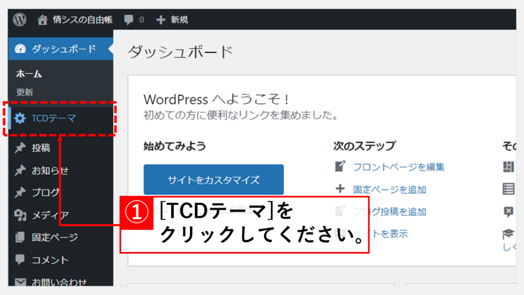 首先,轉到 WordPress 儀表板並單擊左側菜單中的 TCD 主題。