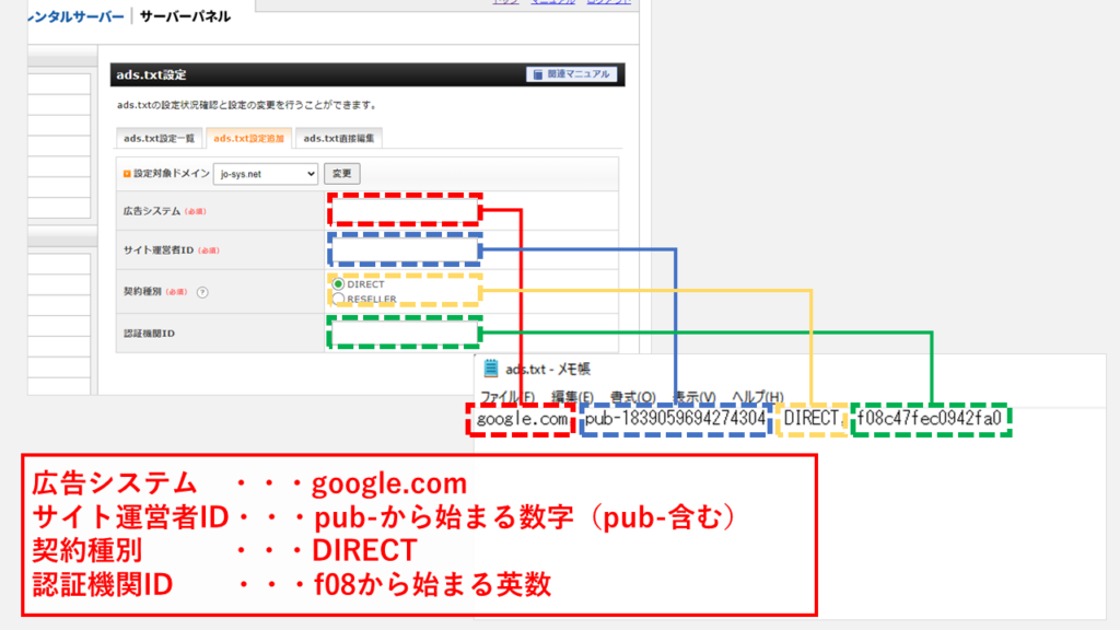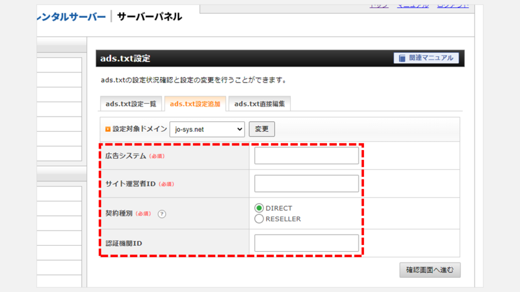 - 選擇目標域並輸入[廣告系統]、[發布者ID]、[合同類型]和[認證機構ID]。 (從 Google AdSense 下載的 ads.txt 中列出了必要的信息。)