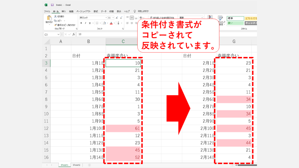 另一方面,缺點是除了條件格式之外的格式,例如邊框和文本字體,也會被重複。