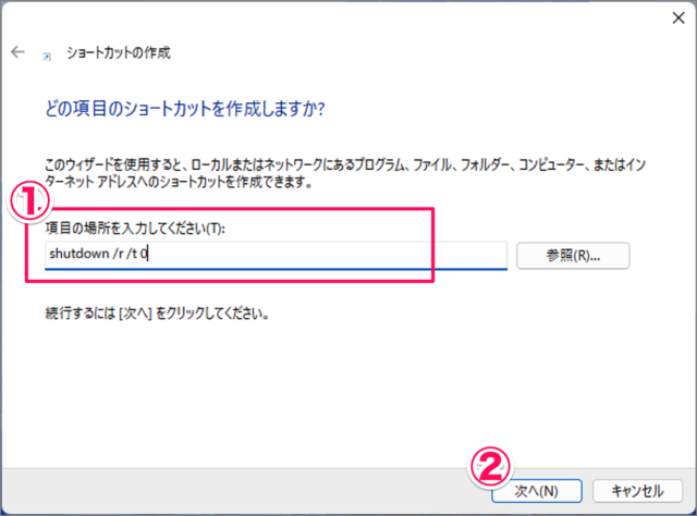 創建快捷方式。- 輸入以下重啟命令