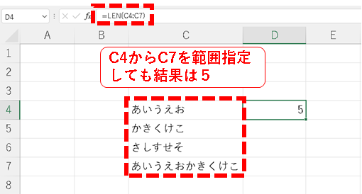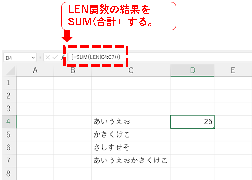 輸入=SUM(LEN(C4:C7))並使用[Ctrl]+[Shift]+[Enter]將其轉換為數組公式{=SUM(LEN(C4:C7))}。