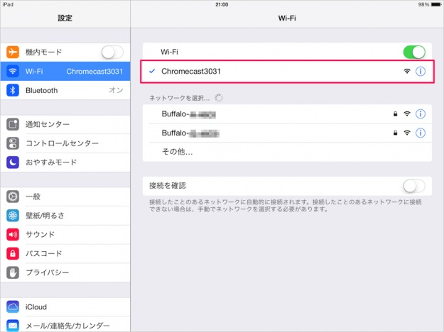 連接到 Chromecast。按“主頁按鈕”配置 iPad 的 Wi-Fi 設置。
