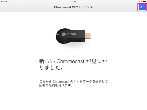 當您返回應用程序時,您將看到“找到新 Chromecast”消息。點擊右上角的“下一步”。