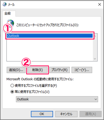 電子郵件個人資料。 ① 選擇配置文件“Outlook”,然後單擊 ②“刪除”。