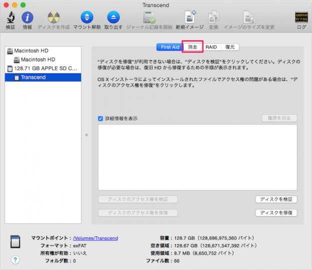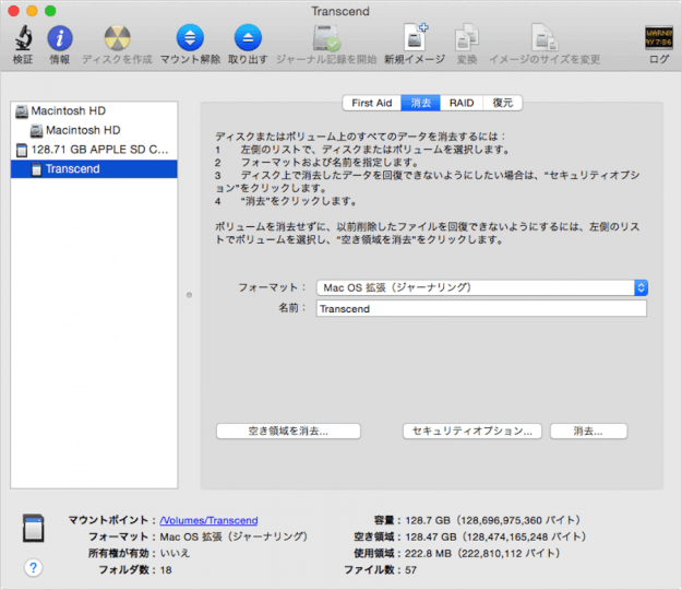您可以按原樣使用它,但默認格式是“exFat”。我認為這張卡只會在Mac上使用,所以將其更改為“Mac OS Extended (Journaled)”。