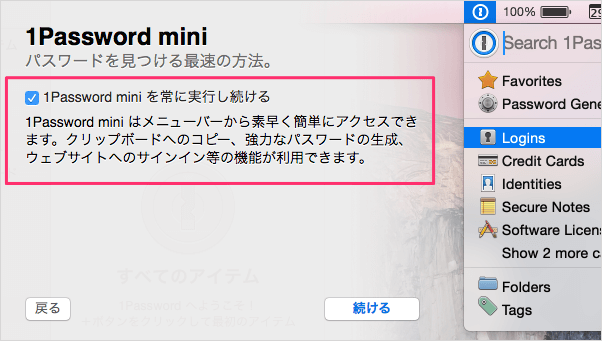 1密碼迷你設置。如果您選中此框,“1Password mini”將駐留在您的菜單欄上,使其更易於使用。