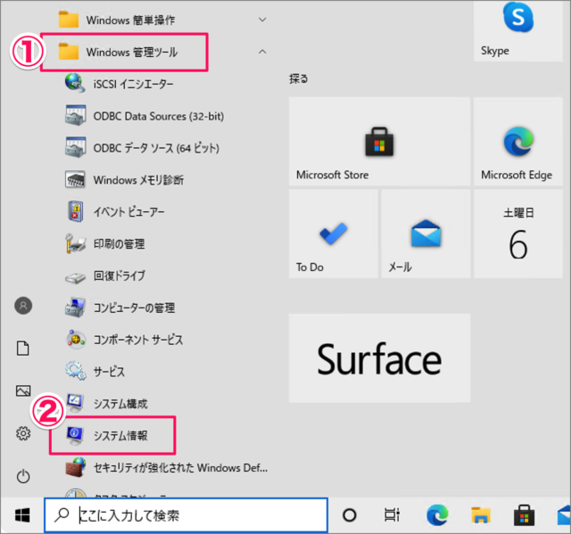 這是開始菜單。 ① 啟動“Windows 管理工具”→ ②“系統信息”。