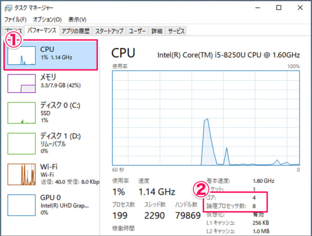 任務管理器的性能。如果從左側菜單中選擇①“CPU”,則可以查看②“核心數”和“邏輯處理器數(線程數)”。