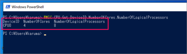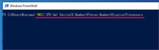 WMIC CPU Get DeviceID,NumberOfCores,NumberOfLogicalProcessors