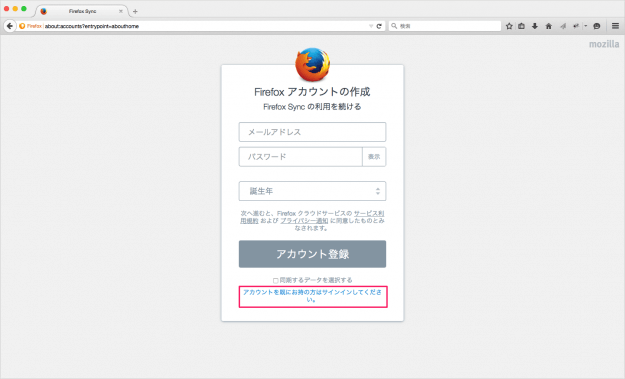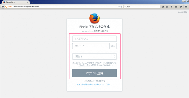 創建一個火狐帳戶。輸入並選擇您的電子郵件地址、密碼和出生年份,然後單擊“創建帳戶”。