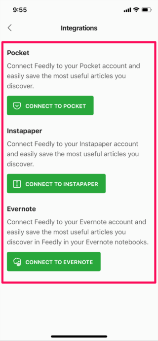 您可以連接到“Pocket”、“Instapaper”和“Evernote”。