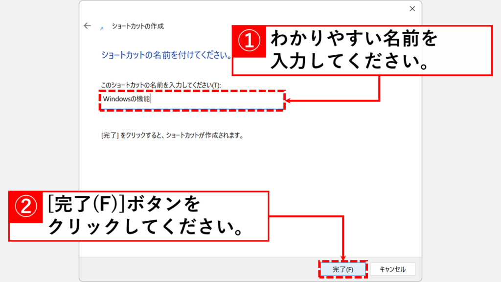 當顯示“請輸入快捷方式的名稱:”時,輸入任意名稱(例如 Windows 功能)並單擊“完成”按鈕。請。