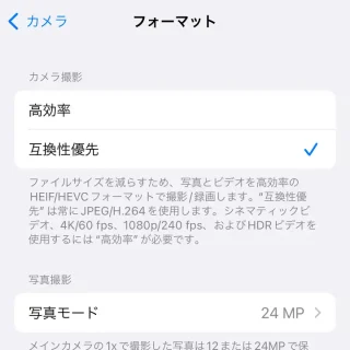 高效率如果選擇 ,它將另存為 HEIF/HEVC 等。互換性優先如果選擇 ,照片/視頻將以 JPEG/H.264 等格式保存,並且照片/視頻的尺寸會變大。